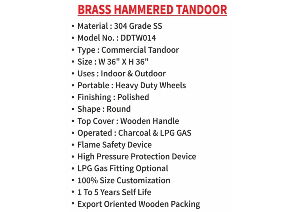 The Brass Hammered Tandoor Model No. DDTW012 by Durga Das Tandoor Wala is a premium tandoor oven designed for both aesthetic appeal and functional excellence. Crafted with a hammered brass exterior, it offers a traditional look that enhances any kitchen or restaurant setting. The tandoor features a durable clay interior, ensuring authentic flavor and efficient heat retention for cooking various dishes like naan, kebabs, and tandoori meats. Its robust construction and elegant design make it a preferred choice for chefs seeking quality and style in their culinary equipment.